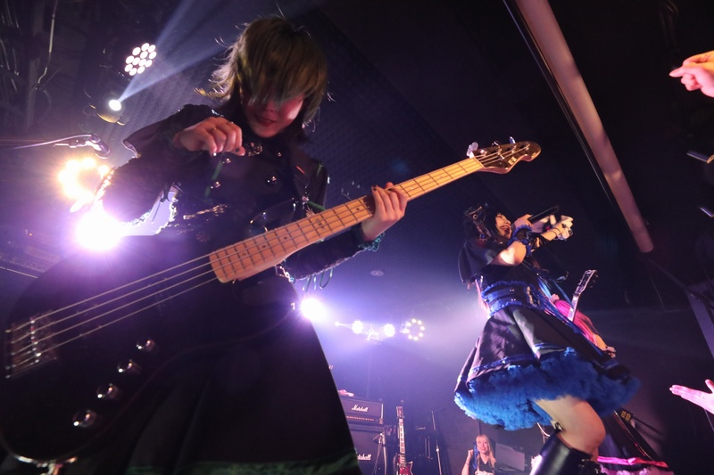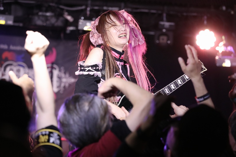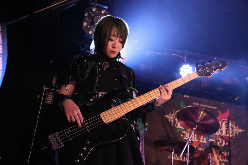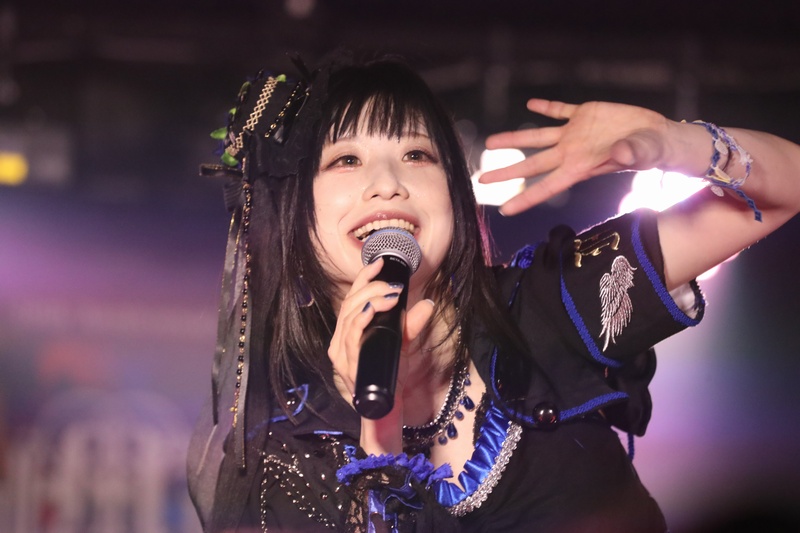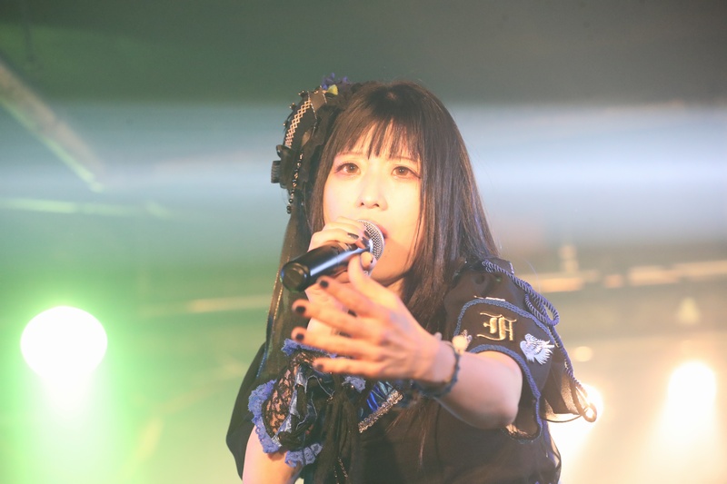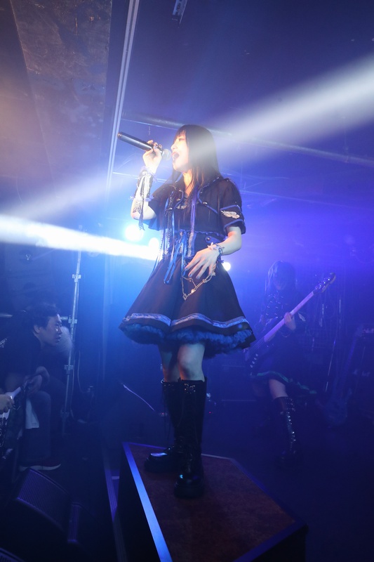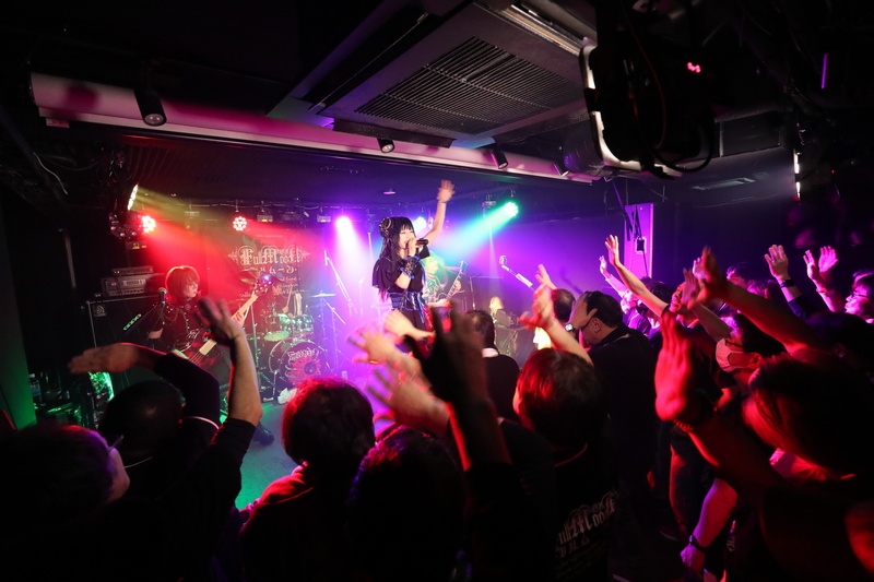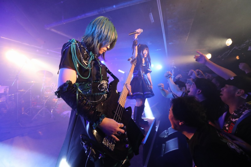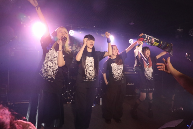 全身の力を込め大音量でリズムを刻み続ける Dr.葵、ハイスピードで聴けるスネアの響きが心地良い。激しいアクションを取りながら、楽曲の基盤とギターとのアンサンブルを弾きこなす Ba.りん。デスボイス、シャウトも映える Gt.えれん。この日もソロ、アクション、デスコーラスの大団円の立ち回り。そしてファンに会いたい、楽しんでもらいたいと、体調が万全ではない状態で全力を尽くす Vo.ねね。「青い月」を経て、会場のファンにメッセージを届ける。