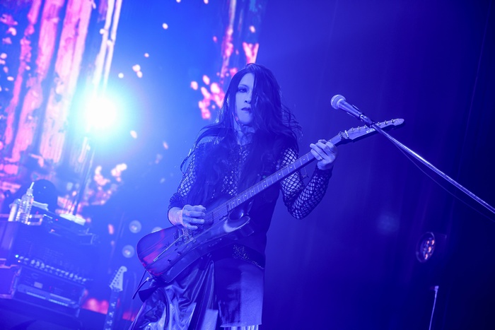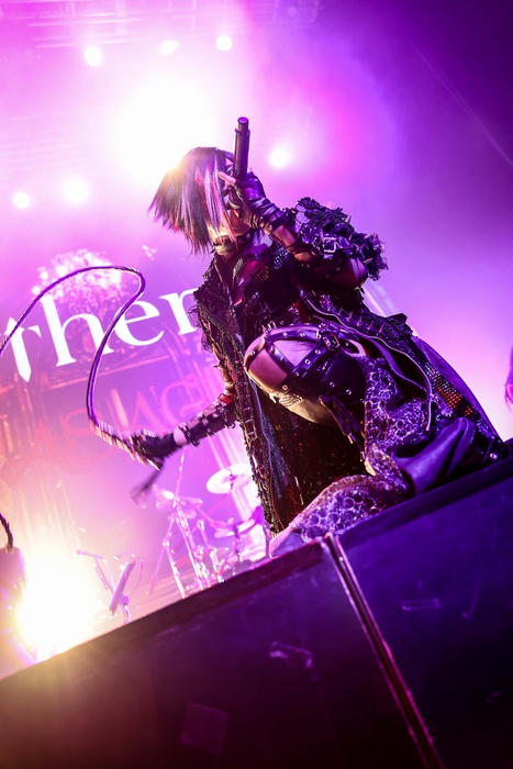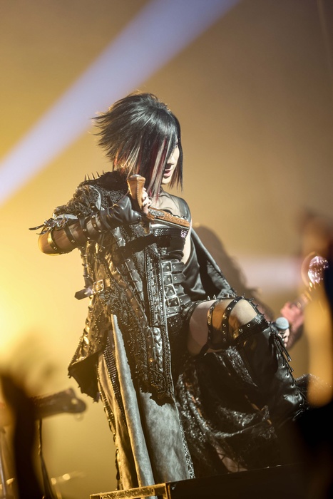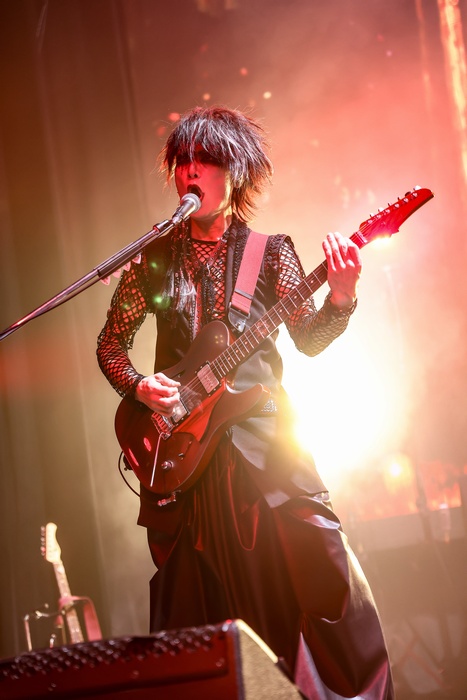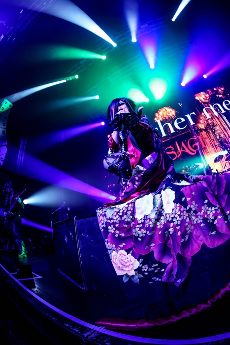 中盤へ移ると「赤い森のロゼ」「LEVEL INFINITY」と幻想的なナンバーが並び、照明はステージを赤く染めあげる。MCを挟んでの「Destrier」「花惑」「メテオ ~夢麻の刻~」と続き、再び世界を闇に侵食させ、ASAGIの声質が持つ独特の艶と毒が存分に発揮されていた。「天啓」「R.E.D. ~Regenerate Emerge Dawn~」と続くブロックは、それまでの世界から一転、誰も手の届かない孤高の世界であり、破壊と創造が無限に繰り返されてるようにも思える。観客は息を詰め、その世界に没入する。