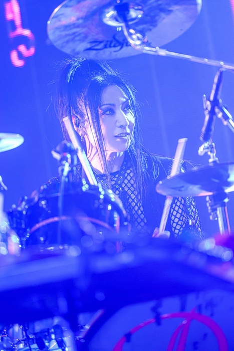 リフレインのようなSEと共に幕が上がると、ASAGIを筆頭に幻想的なシルエットが浮かび上がった。一曲目はツアータイトルでもある「Another me」。タイトルチューンでありながら、ツアー全体の核として位置づけられたこの曲は、イントロの印象的なフレーズが会場全体を震わせ、ASAGIのヴォーカルとメッセージが胸に鋭く突き刺さる。ステージとフロアがまるで鏡のように反響し合った。続く「Sleeper」「弾丸」はASAGIがD時代に作り上げた名曲であり、ASAGIの歌声と盟友HIROKIのドラム捌きのコンビネーションに観客もヒートアップが止まらない。そして畳み掛けるように「HUNTING」が続き、序盤はASAGIが持つ鋭利さと、エモーショナルの絶妙なバランスが心を躍らせた。