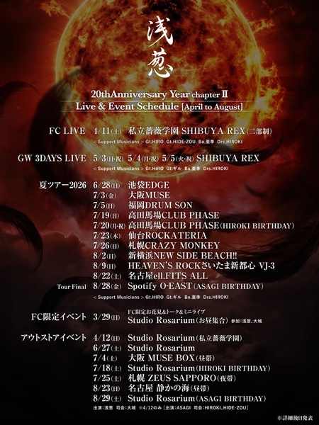 「魑魅 -SUDAMA-」へ移行すると、Ba.は燿から再び亜季へ。鬼女の悲鳴は会場を切り裂くようだ。「天地行きて来る小舟」が静かに流れると、空気は一変し浅葱のメジャーデビュー曲「月界の御子」へ。叙情的な深みを帯びながらも浅葱の力強い声が天を貫くように響く。「桃太郎伝記 ~我武者羅~」では浅葱独自の桃太郎の持つ鬼の力と人間らしさが観客にエールを与える。